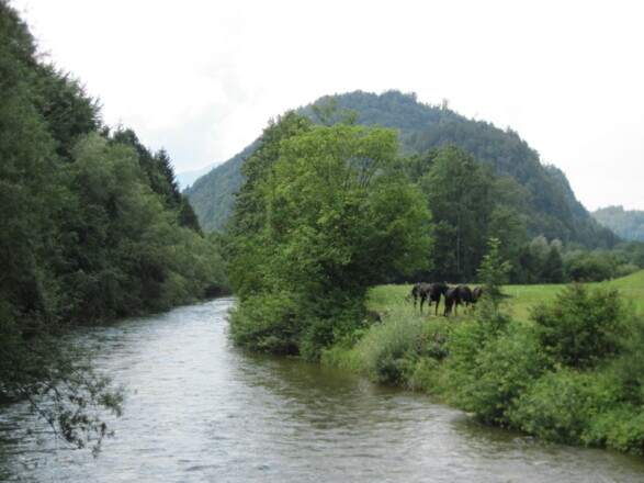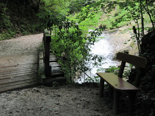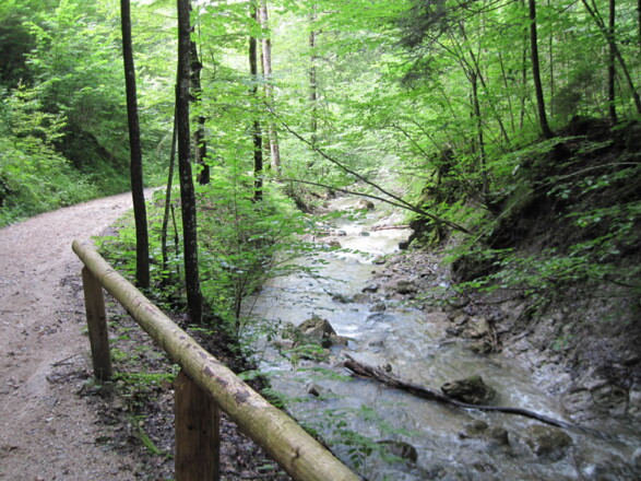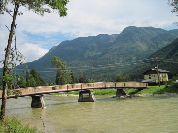 Im Ortszentrum von Strobl folgen Sie der Bürglstraße nach Norden zur Brücke, unter der die Ischler Ache aus dem Wolfgangsee fließt. Direkt davor gehen Sie rechts über eine Metalltreppe hinab zum schmalen Achenweg, der neben dem Ufer des Flusses verläuft und nach 800 m unter einer Straßenbrücke durchführt. Nach weiteren 700 m endet er bei der nächsten Brücke. Dort rechts auf dem Fahrweg weiter, bis Sie links auf den beschilderten Römerweg abzweigen. Dieser mündet in die Schwarzenseestraße, auf der Sie links über die Ischler Ache (und damit über die Landesgrenze nach Oberösterreich) gelangen. Jenseits biegen Sie nach einem Gebäude rechts auf den Weg Nr. 32 Richtung Bad Ischl ab, der nun dem Nordufer der Ischl entlangführt. Nach der Ableitung des Mühlbachs rechts weiter, bei der nächsten Brücke die Straße überqueren und an einer Fischtreppe vorbei. In der Ortschaft Windhag rechts Richtung Aigen-Voglhub abbiegen (Schild „Nussensee – Bad Ischl“), auf einer Fußgängerbrücke über den Fluss und drüben – wieder im Salzburger Land – links auf dem Bachweg mit der Nr. 18 weiter (geradeaus käme man zu einer Bushaltestelle). Teils auf geschotterter Trasse, teils auf Asphalt durch eine Siedlung und schließlich rechts zur nahen Bundesstraße (Bushaltestelle). Hinter der Unterführung befindet sich der Gasthof Zur Wacht (542 m) im Weiler Ramsau. 1:15 h.