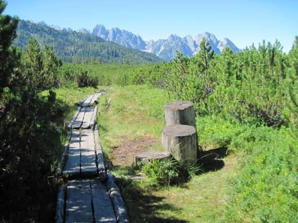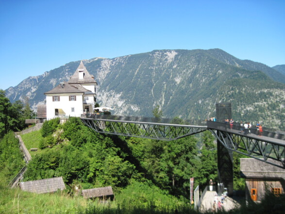 Durch eine Art Grasdschungel und auf Holzstegen wandern Sie hinab ins Salzbergtal, wo Sie eine Straße erreichen. Rechts unten befindet sich das heutige Salzbergwerk; der breite, aber steile Weg dorthin passiert mehrere Grubeneinfahrten. Vorbei am Eingangsgebäude des Schaubergwerks (Salzwelten Hallstatt) und an einem „begehbaren Grab“, das an das hier entdeckte Gräberfeld mit mehr als 2000 bestatteten Menschen aus dem 1. vorchristlichen Jahrhundert erinnert, erreichen Sie den Rudolfsturm (855 m). Unterhalb dieses mittelalterlichen Wehrturms, der heute ein Restaurant beherbergt, bietet die Aussichtsplattform „Welterbeblick“ einen tollen Tiefblick auf den 300 m tiefer gelegenen Markt Hallstatt und den Hallstätter See. 2:00 h