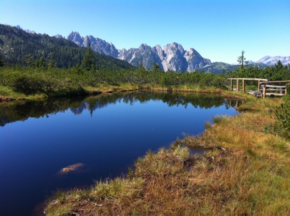 Vom Gasthof Gosauschmied in Gosau-Hintertal folgen Sie der Gosauseestraße etwa 500 m talauswärts. Vor einer Brücke und einer Linkskurve zweigen Sie vor der Bushaltestelle Gamsjäger scharf nach rechts auf die Madlgasse ab. Nach etwa 300 m beginnt rechts der Wanderweg Nr. 644 mit dem Wegweiser „Plankensteinalm, Schleifsteinbrüche, Löckernmoos“, auf dem Sie durch steile Waldhänge ansteigen. Er quert zwei Forststraßen, zweigt rechts ab und erreicht die Schleifsteinbrüche unter dem Ressenberg. Dieses Gebiet besteht aus feinkörnigem Sandstein, der sich vor etwa 80 Millionen Jahren im Meer abgelagert hat – er wird seit 400 Jahren zur Herstellung von Schleif- und Wetzsteinen abgebaut. Von der gastlichen Badstubnhütte führt ein neu angelegter, beschilderter Pfad durch urigen Wald ins Löckernmoos (1.410 m) hinauf. Dieses streng geschützte Hochmoor liegt auf der Kuppe des flachen Berges, ist mit „Löckern“ (Legföhren oder Latschen) bewachsen und weist sogar einen kleinen See mit dunklem Moorwasser auf. Von einem Aussichtsplatz aus sehen Sie viele Gipfel in der Umgebung – vom Hochkalmberg über den Gosaukamm bis zum Hochkönig. 2:00 h