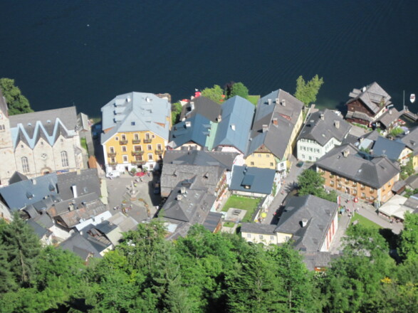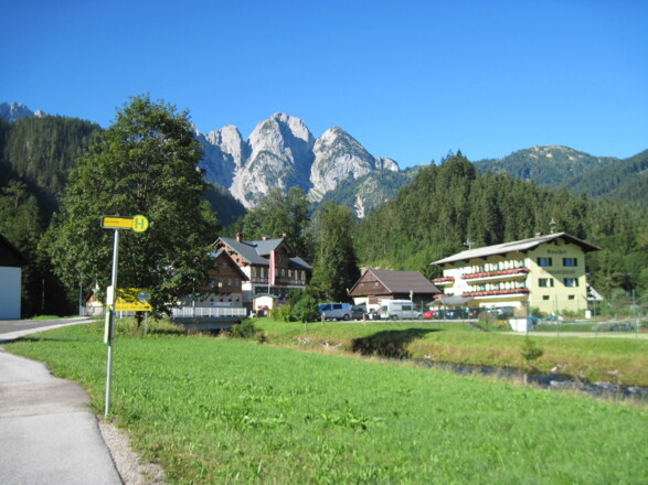 Vom Rudolfsturm wandern Sie zuletzt auf dem Salzbergweg nach 91 Hallstatt hinunter. Die breite Trasse ist zwar nicht hochalpin, wie eine Tafel warnt, sie führt aber im Zick-zack durch steile, felsdurchsetzte Waldflanken talwärts. Unterwegs passieren Sie den Franz-Joseph-Stollen; weiter unten lohnt sich der Abstecher links zum Wasserfall in der Mühlbachschlucht. Darunter erreichen Sie bei einer Aussichtswarte eine Forststraße, auf der Sie links weitergehen. Bald danach führt rechts der Gaiswandweg zwischen Lawinenverbauungen zum Friedhof der Katholischen Pfarrkirche in Hallstatt (511 m) hinunter. Über die Kirchenstiege kommen Sie zur Gosaumühlstraße, die rechts zur Schiffsanlegestelle vor der Evangelischen Kirche und weiter zum malerischen Marktplatz führt. 1:00 h