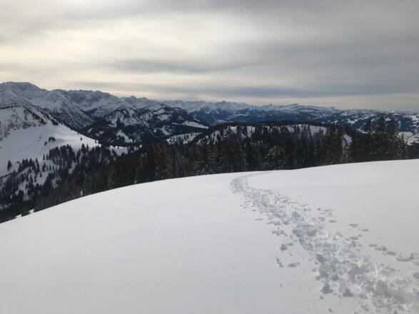 Das Wertacher Hörnle ist eine beliebte Schneeschuhtour auf einen größtenteils bewaldeten Voralpengipfel. Die Tour ist bei normalen Verhältnis nur wenig lawinengefährdet.