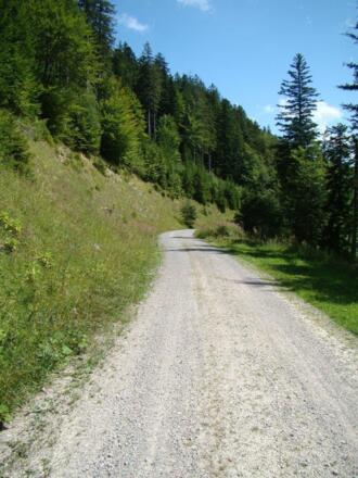 - Hinter einer Schranke wird der Weg wieder besser befahrbar. Es geht stetig bergauf. Zum Teil ist der Boden etwas sandig und daher schwer zu befahren. Die Strecke führt aber durch den Wald, daher ist es selbst bei hohen Temperaturen immer angenehm kühl und schattig.