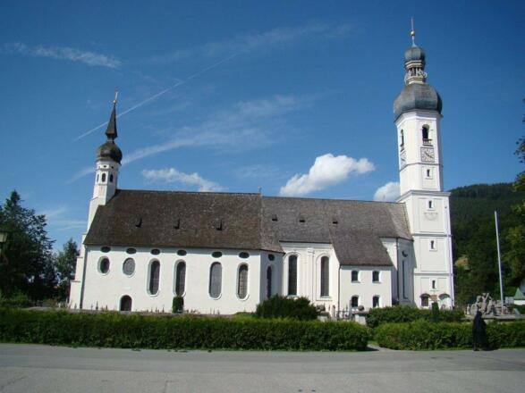 - Unten trifft man auf die Verbindungsstraße zwischen Hundham und Bad Feilnbach. Sie halten sich links und müssen nun eine kurze Etappe an der Straße fahren. Es geht noch mal bergauf und nach einer Abfahrt kommt erneut eine kleinere Steigung, nach dieser zweigt ein kleiner Feldweg nach links ab in Richtung Greisbach - Elbach. Leider befindet sich hier kein Hinweisschild, nur ein Schild das auf Viehtrieb (rotes Dreieck mit Kuh) hinweist. Nun folgen Sie der Beschilderung Bodensee-Königsee-Radweg. Bei der ersten Kreuzung nach rechts und bei der nächsten Kreuzung links. Bald haben Sie Elbach erreicht und rollen zurück zum Wanderparkplatz. Gegenüber des Parkplatzes auf der anderen Straßenseite befindet sich noch ein Gasthaus (Schmidtwirt Elbach) in dem man sich bei einer Brotzeit von den Strapazen erholen kann. Kulturfreunde können noch einen Blick in die schöne Kirche werfen.