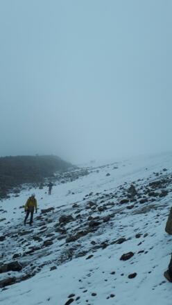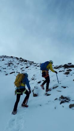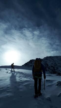 Wir hatten im unteren Teil eine leichte Schneeauflage und konnten, auch ohne Steigeisen, entspannt bis zur Hälfe des Gletschers aufsteigen.