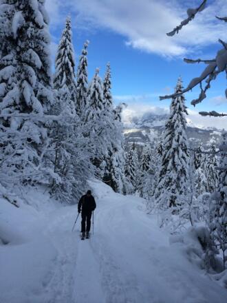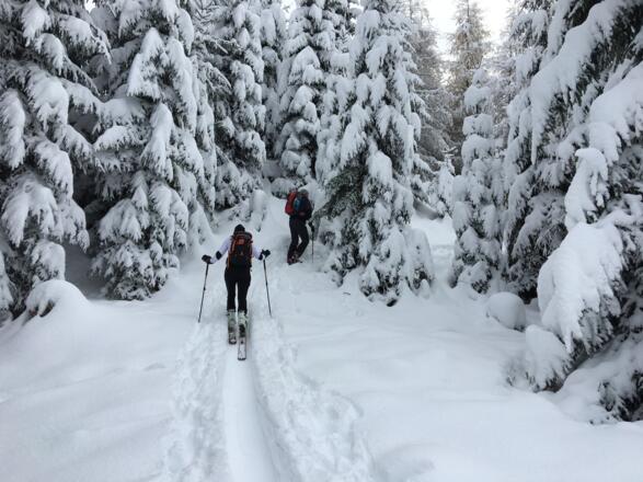 Herrliche Skitour durch den tief verschneiten Wald mit Ziel Kreistenalm