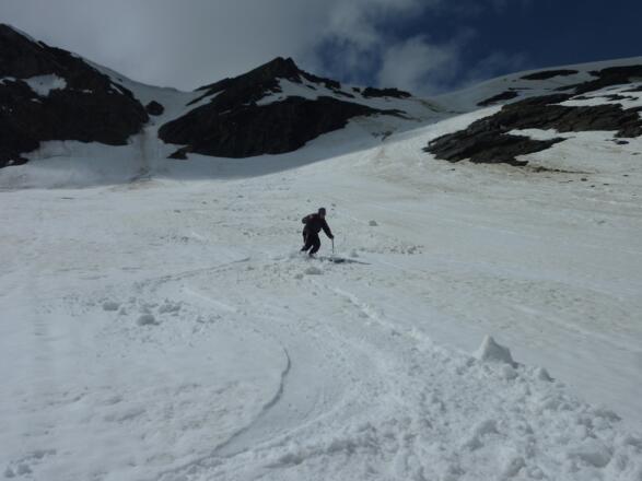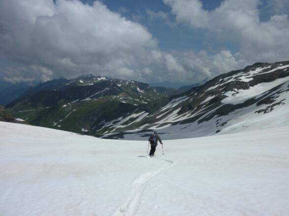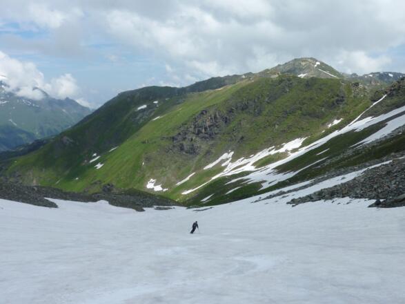 Die Abfahrt erfolgt entlang des Anstiegsweges. Man kann auch etwas direkter über die kurze Nordostflanke zum Brennkogelkees hinunter abkürzen, maximal ca. 38 Grad Neigung. Gegenanstieg zurück zum Fuscher Törl ca. 30 Minuten.