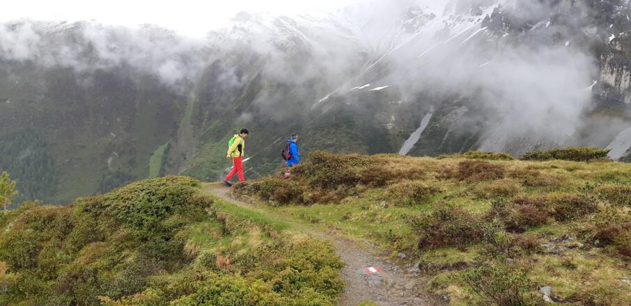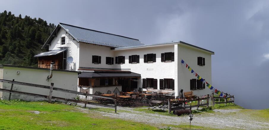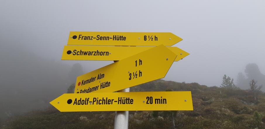 Nach Erreichen des Bergrückens kann auch direkt zur Adolf-Pichler-Hütte abgestiegen werden (beschildert).