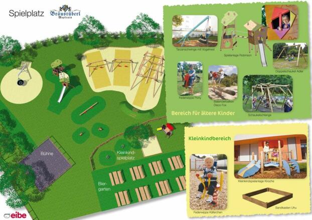 Der gesamte Bereich ist gut einsehbar vom angrenzenden Biergarten, schön umrahmt von Bäumen und Sträuchern. Nach Altersgruppen getrennt durch einen Spielzaun können die Eltern von Kleinkindern unbesorgt ihr Bier oder ihre Brotzeit zu sich nehmen, ohne dass sie Angst haben müssten, dass ihr Kind in den Bereich von Schaukeln gelangt.