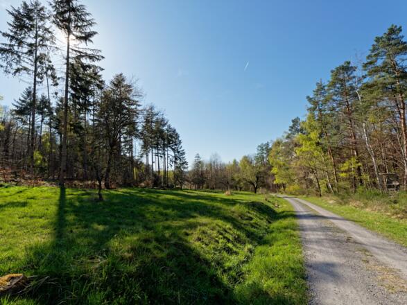 Die Stadtwaldrunde beginnt am Ende des Seeweges mit dem Wanderzeichen "E5". Zunächst geht es etwas aufwärts auf dem Streiter Kirchenweg. Nach ca. 100 m führt der Weg nach rechts und erreicht über das Streuobstgebiet „Neurod“ und vorbei am Sportplatzder Frankonia Mechenhard die ersten Wohnhäuser in der Jahnstraße. Kurz vor deren Ende biegen Sie nach links ab und folgen jetzt dem Wegzeichen "E4" . Immer am Waldrand entlang wandern Sie jetzt mit dem Wegzeichen des "Fränkischen Rotwein Wandweges" bis in die Senke des Witterbachs, wo Sie nach links abbiegen. Kurz danach führt ein schmaler Pfad nach rechts hinab zum nur selten Wasser führenden Bach. Dort sehen Sie linkerhand eine gegen Wildverbiss eingezäunte Wiederaufforstungsfläche. Die dort neugepflanzten Laubbaumarten sollen den Waldumbau hinzu einem klimaresistenteren Mischwald voranbringen. Die Markierung "E2" führt Sie bis zur Orgelwiese und weiter zum Waldfriedhof von Erlenbach. Von dort folgen Sie dem Wegzeichen des "Mainwanderweges" und kommen oberhalb der Helios-Klinik und der Wohnbebauung „Am Stadtwald“ wieder zum Ausgangspunkt am Spielplatz Neurod zurück.