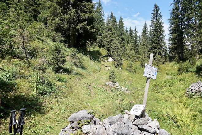 Auf Höhe der Alm gehen wir beim dortigen Schilderbaum (aktuell ohne Hinweistafel zum Straubinger Haus) links zum Waldrand und folgen rechts bergauf einem mit roten Punkten markierten Steig, der sich in langen Serpentinen ziemlich gleichmäßig zum Klausenberg hochschlängelt.