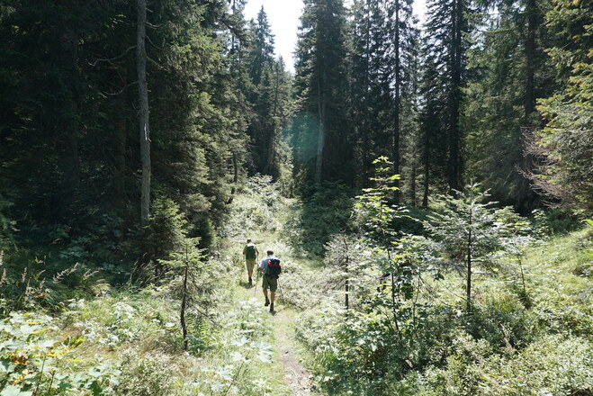 Wenig begangene Tour auf größtenteils schönen schmalen Steigen durch schattigen Wald und klein strukturiertes Almgelände.