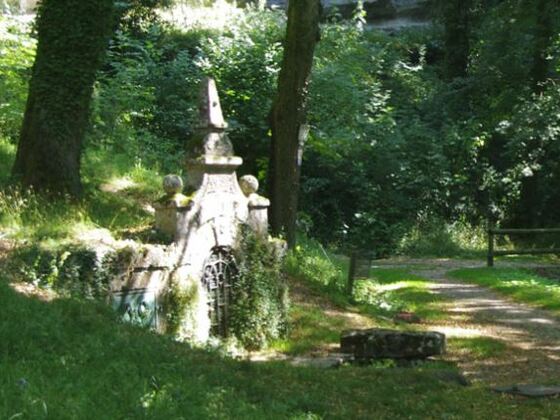 Ein paar Schritte weiter offenbart sich, warum der Maler dies für den schönsten Wanderweg der fränkischen Schweiz hielt: Eine uralte Allee hellgrün im Sonnenlicht leuchtender und kühlen Schatten spendender Bäume säumt die Talseite des breiten Weges, dessen Hangseite mit megalithisch großen Blöcken aus Kalktuff gegen den Berg abgestützt ist. Dies ist die Wandelhalle des Kurorts mitten in der Natur!