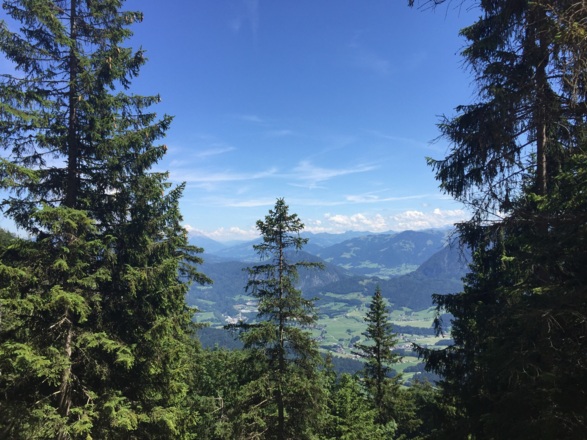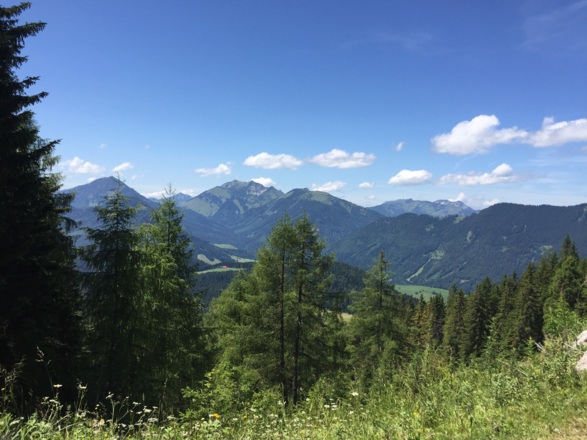 Schöne Wanderung über die Forststraße Zum Pendling, 5,7 km einfach. Der Aussichtsberg auf 1.565 m bei Kufstein, Tirol mit Rundumblick zum Kaisergebirge, zu den Zillertaler Alpen, Großvenediger und Großglockner.