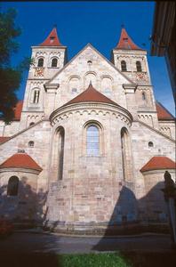 Ellwangen: Das erste Benediktinerkloster im heutigen Württemberg war 764 eine Gründung Hariolfs und seines Bruders Erlof, dem Bischof von Langres in Burgund. Im Jahre 838 lebten hier 160 Mönche! Die Abtei lag an einem Überlandweg vom Rhein zur Donau und diente an der Ostgrenze Frankens der Festigung des Christentums in der Karolingerherrschaft. Schon 814 verlieh Ludwig der Fromme die dortige freie Abtwahl. Die bisherigen Hauptpatrone Sulpicius und Servilianus wurden um 980 durch den Hl. Vitus verdrängt. Schon aus dem 8. Jahrhundert stammt die Vorläuferkirche zur 1427 erbauten Marienkirche. Im 12. Jahrhundert ist ein Markt nachweisbar, der Wunsch nach einer Stellung des Klosters als Reichsabtei und die Namensgebung nach dem Ordenspatron St. Vitus wurde laut. Die dreischiffige Krypta unter der Vierung wurde um 1200 begonnen. 1201 bzw. 1229 wird Ellwangen als civitas bezeichnet, 1215 erscheinen die Äbte als Reichsfürsten auf der neuerbauten Burg (1266). Schlechte Verwaltung, Schwinden der Klosterzucht und Brandzerstörungen (1443) bewirkten einen Niedergang, so dass 1460 das Kloster in ein weltliches Chorherrenstift mit einem Fürstpropst/Stiftskapitel umgewandelt wurde. Kreuzgang, Liebfrauenkirche, St. Wolfgangskirche wurden neu gebaut, die Reformation abgewiesen. 1611 Jesuitenniederlassung die sich zum Kollegium mit Gymnasium entwickelte, die Jesuitenkirche ist heute evangelische Stadtkirche. In württembergischer Zeit waren Bestrebungen im Gange, Ellwangen zum Bischofssitz zu erheben. 1812 erhielt die Stadt ein Generalvikariat, Priesterseminar und eine katholisch-theologische Universität. Ersteres wurde 1817 nach Rottenburg verlegt, die katholisch-theologische Fakultät wurde der Universität Tübingen angegliedert.Der neuromanische Altaraufsatz (um 1880) enthält Reliquien der 16 Stiftsheiligen, auch die Reliquien der o. g. Sulpitus und Servilianus.