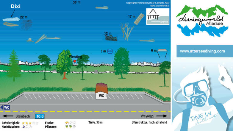 Weiter nach rechts wurde in 6 m Tiefe eine zur Taucherglocke umfunktionierte Badewanne angebracht. Von dort taucht man im 5 Meterbereich über große Felsen und manchmal auch große Hechte zurück.
