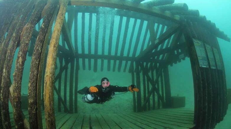 Taucheinstiegstelle Dixi - Pfahlbauhaus unter Wasser und Unterwasserkrippe