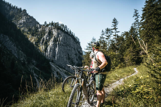 Du fährst am Jagahäusl geradeaus weiter und biegst bei der nächsten Forststraßengabelung links Richtung „Schaumbergalm“ ab. Der Forststraße (und nicht dem Fußweg) bergauf folgen, bis in einer Linkskehre ein kleinerer Karrenweg geradeaus weiterführt. Du folgst dem Weg weiter bergauf sehr schön das Tal hinein, welches immer enger wird. Der Weg wird immer kleiner und entwickelt sich nach einer Links-Rechts-Kehre zu der schon erwähnten Singletrailpassage: Nun ist der Weg ziemlich schmal und schottrig und führt immer ansteigend den recht steilen Hang entlang aufwärts. Diese Passage kann von versierten Mountainbiker durchaus befahren werden – aufgrund des durchaus steil abfallenden Geländes rechtsseitig empfehlen wir jedoch, im Zweifel das Bike zu schieben (der Zeitverlust hält sich in Grenzen). Nach einiger Zeit wechselt der Belag von Schotter auf Waldboden und Du erreichst so den kleinen Sattel „Steysteg“, wo Du wieder auf eine Forststraße stößt.