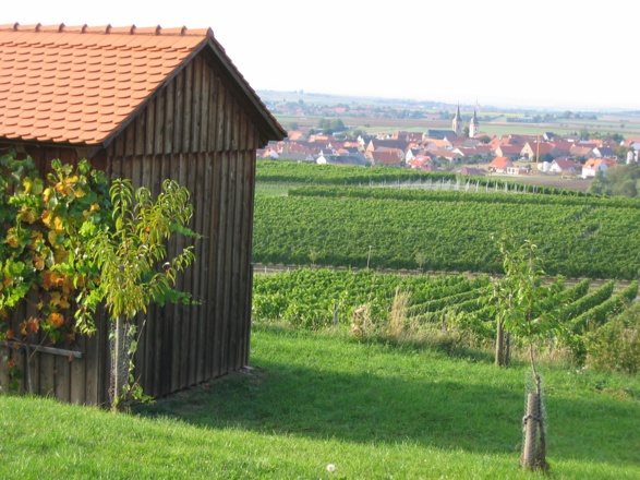 Von Hüttenheim: Am Marktplatz mit historischer Kirchenburganlage führt der ausgeschilderte Weg durch den Weinort, am Wanderparkplatz und Kneippbecken vorbei, zum Startpunkt in die Weinberge.