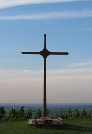 Durch den Taleinschnitt steigt der Weg auf das Plateau des Hüttenheimer Tannenbergs hinauf. Hier eröffnet sich ein grandioser Rundblick über das Weinparadies und in die fränkische Landschaft. Ein beliebter Rastplatz ist das Kreuz am Tannenberg (9), welches zur Erinnerung an die Wiedervereinigung Deutschlands errichtet wurde. Durch ein kleines Wäldchen geht es zurück nach Hüttenheim.