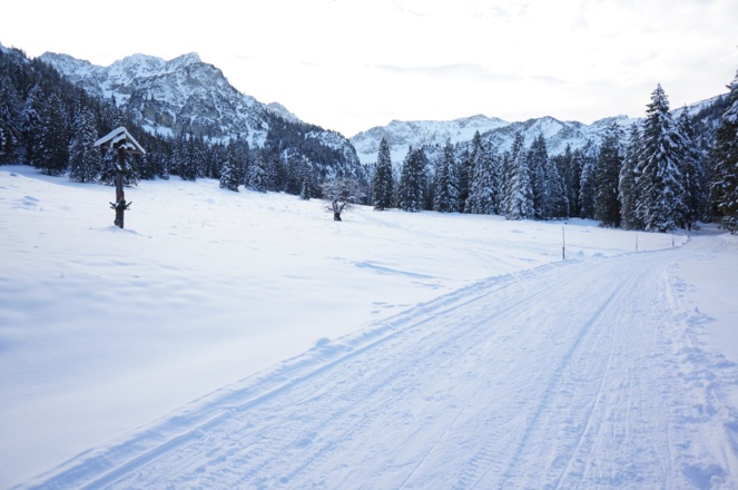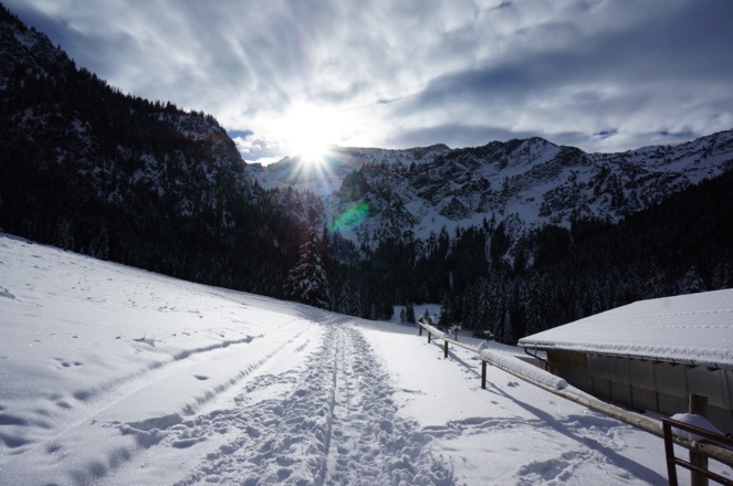 Hinauf in die Berge! Zugegeben – Kondition ist schon nötig, um den Aufstieg zu bewältigen. Doch die Belohnung ist reichhaltig. Nach einer guten Stunde Gehzeit durch den Bergwald sind wir dem Alltag völlig entflohen und genießen das winterliche Hochgebirge. Das sonnige Hochtal eröffnet wunderschöne Ausblicke auf die nahen Tannheimer Berge. Auf 1227 Meter liegt die Vilser Alpe und bietet als weitere Belohnung regionale Köstlichkeiten. Die Einheimischen gestalten ihren Rückweg gern rasant mit einer Rodelpartie auf Schlitten.