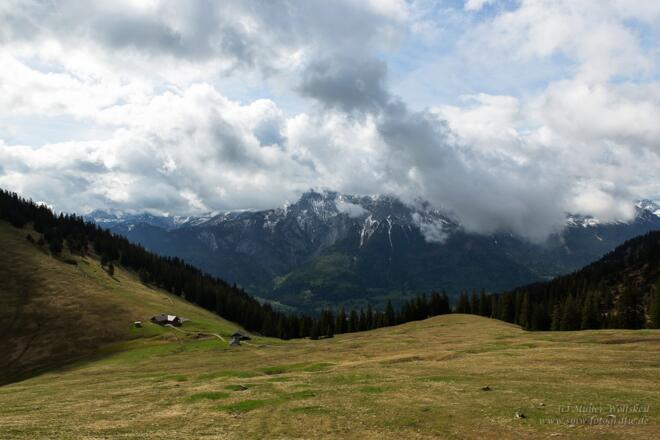 Von der Alm aus ist der Weiterweg schon gut zu erkennen. Während es rechts zum Kramer und links weiter zum Hohen Ziegspitz geht, wandern wir geradeaus den immer steiler werdenden Wiesenhang bis zum Waldrand hinauf.
