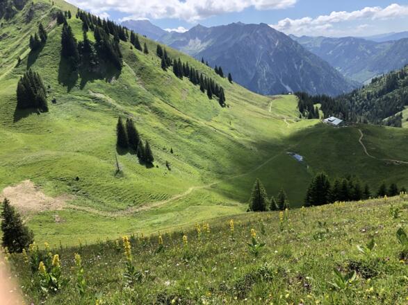 Wir starten in Hinterstein und laufen über Zipfelsalpe, Bschießer und Ponten zur Willersalpe und wieder zurück ins Hintersteiner Tal.
