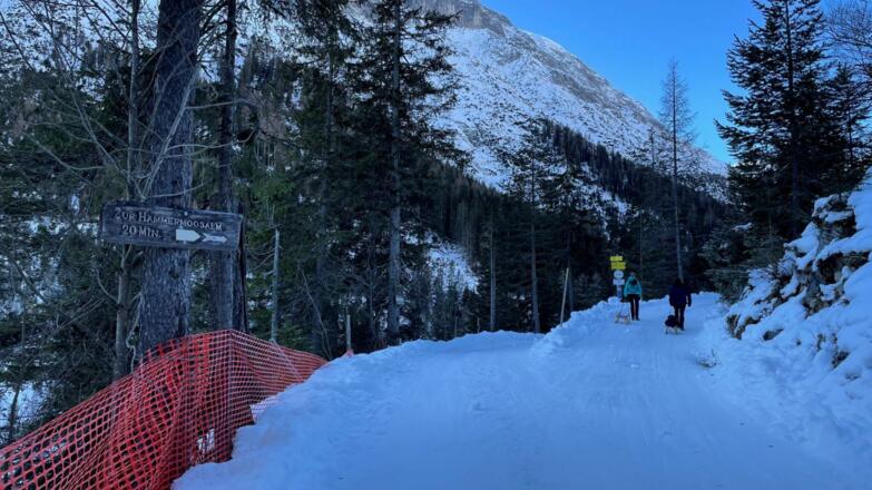 Diese kurzweilige und familienfreundliche Winterwanderung führt wahlweise vom Infohäuschen am Eingang zum Gaistal über die Leutascher Ache und flußaufwärts bis zur Wegbeschilderung Hämmermoosalm, oder vom letzten (gebührenpflichtigen) Wanderparkplatz am Salzbach (P3-5) direkt zum Hüttenaufstieg. Bergab darf die Strecke auch gerodelt werden, wer mag bringt darum gleich seinen Schlitten mit.