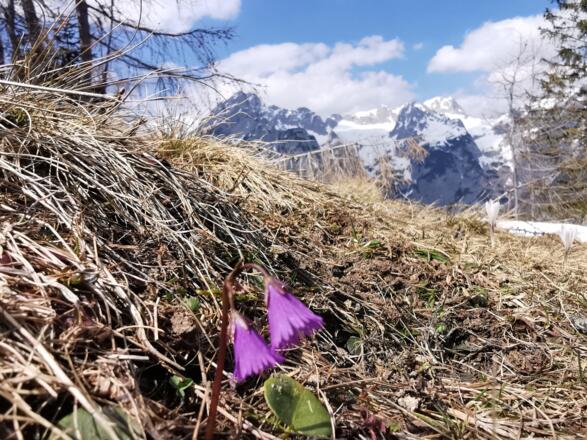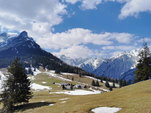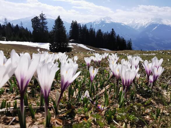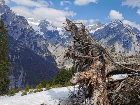 Wenn wir auf die Lichtung kommen, eröffnet sich ein traumhaftes Panorama mit Blick auf das Karwendel, sowie das Inntal und die Tuxer Alpen.