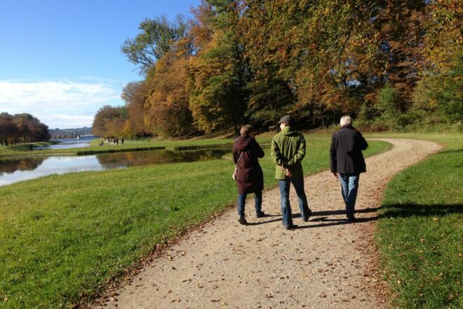 Am Latonabrunnen und den Blumenrabatten vorbei gelangen wir zu einem schattigen Spazierweg, der uns in etwa zwanzig Minuten zum Kloster, der daneben liegenden Schlosswirtschaft und zum Dampfersteg zurückbringt.