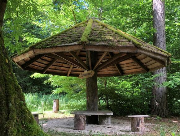 Auf in den Wald! Durch den Dürnbucher Forst geht es zum kleinen Rastplatz mitten im Wald. Unter dem Dach des Holz-Schwammerls kann man eine Pause einlegen oder sogar ein kleines Picknick machen.