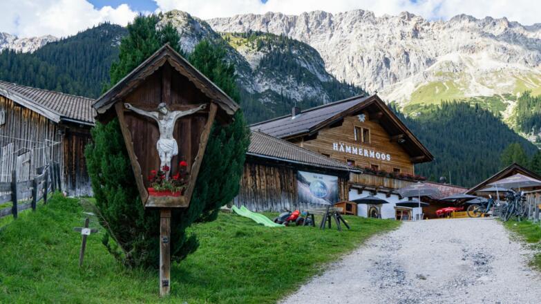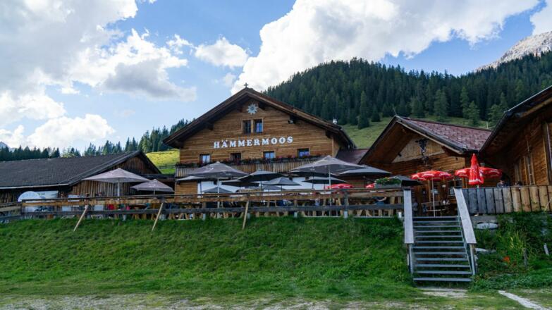 Diese kurzweilige und familienfreundliche Wanderung führt (wahlweise vom Infohäuschen am Eingang zum Gaistal über die Leutascher Ache und flußaufwärts bis zur Wegbeschilderung Hämmermoosalm), oder vom letzten (gebührenpflichtigen) Wanderparkplatz am Salzbach (P3-5) direkt zum Hüttenaufstieg.