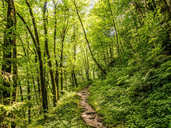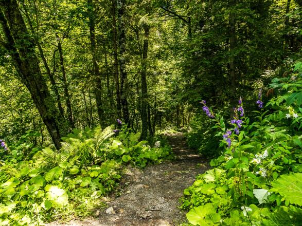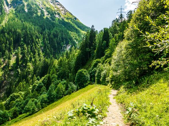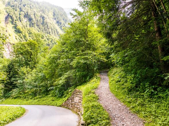 Dieser schöne Waldweg führt nach kurzem Anstieg auf die alte Bergstraße. Von dort geht es zur Talstation des Lärchwand-Schrägaufzuges.
