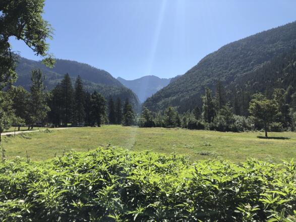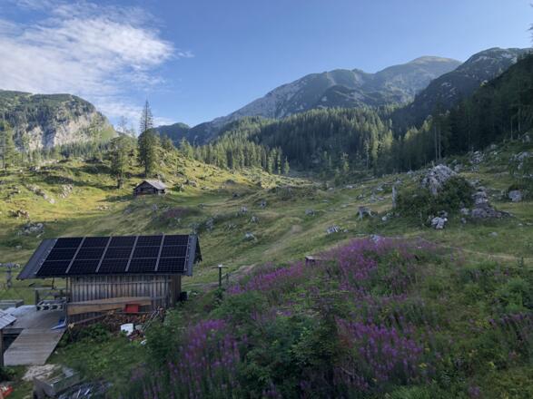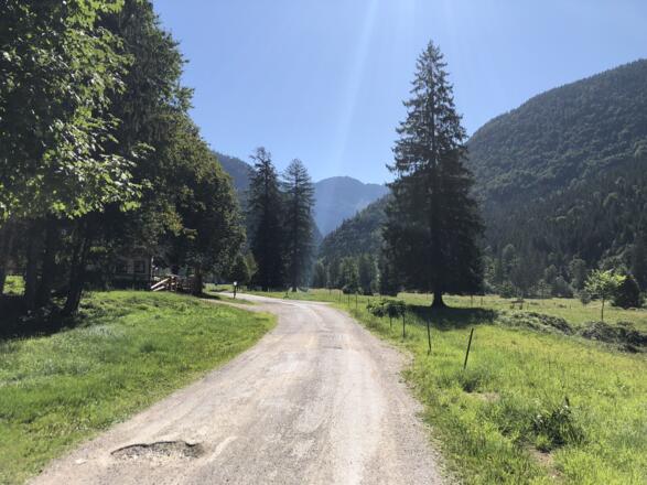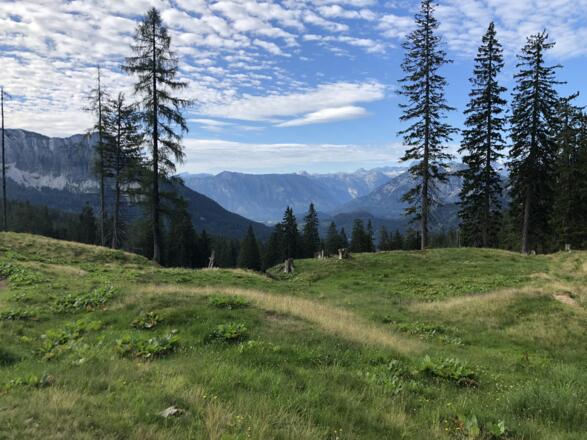 Nach der überaus gastfreundlichen Übernachtung in der Ischlerhütte brechen wir ohne Zeitdruck zum Abstieg auf, der anfangs mit einem Aufstieg zum talseitigen Ende der konkaven Ischleralm beginnt. Beeindruckend idyllisch ist der Abstieg, wie es auch die weite Ebene der Rettenbachalm (630 m, 1h Gehzeit) ist. Hier würde sich ein vormittäglicher Kaffee anbieten, und Zeitstress haben wir keinen, zumal wir wissen, dass Züge zumindest im Stundentakt gen Wels / Linz fahren, und somit keine Reservierung notwendig war.