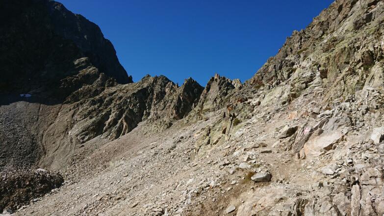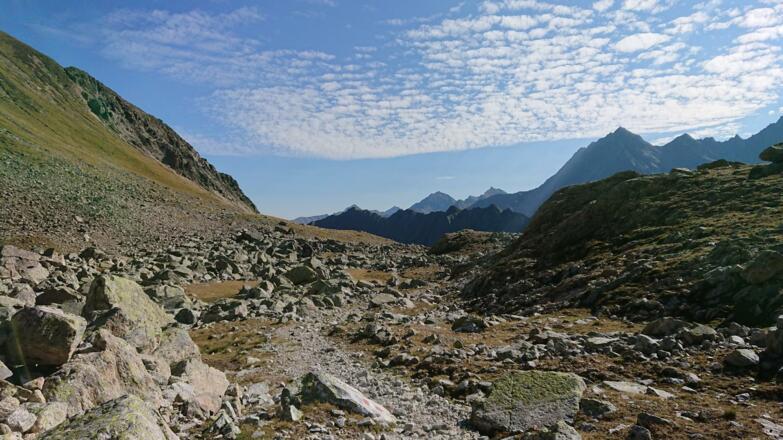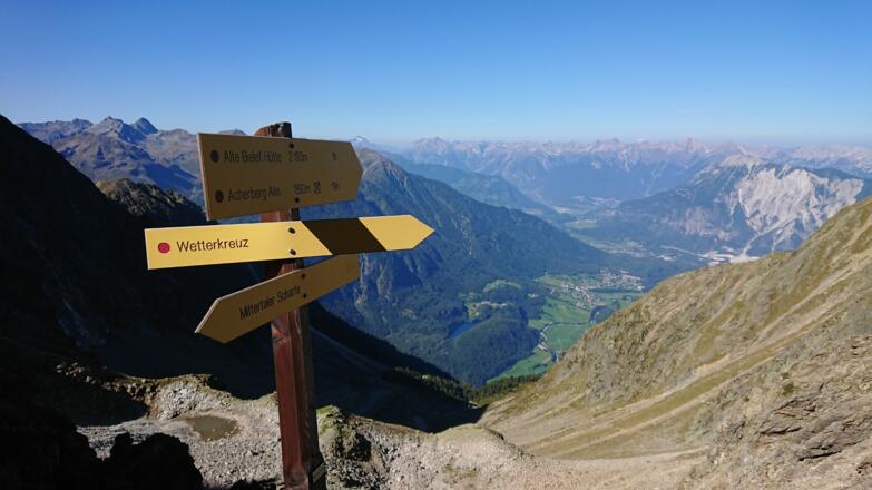 Vom Parkplatz in Richtung Dortmunder Hütte. Daran vorbei zum Stausee runter. Über den Staudamm und dem Weg weiter folgen. Am Abzweig Richtung Mittertalscharte / Achterkogel. Über die Brücke dem Weg folgen. Nach einer Weile wird es unübersichtlich. Notfalls dem Bach folgen bis zum richtigen Weg. Dann geht es über ein sehr schönes Steinfeld weiter zum steilen und anstrengenden Teil der Tour. Einige stellen sind mit Ketten versichert und es sind Stufen eingeklebt. Nach der Scharte geht es an teils versicherten Stellen bergab. Nach einer Weile der leichten Kletterei an den versicherten Stellen führt ein schöner entspannter Pfad zum Wetterkreuzkogel. Der Abstieg führt über einen Wanderweg / Pfad zur Hauptstraße im Tal und von dort über den Kaiser-Franz-Josef-Weg zurück nach Kühtai.