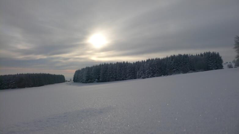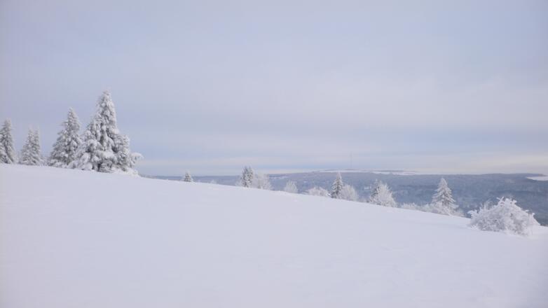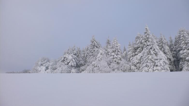 Leicht ansteigender Weg an verschneiten Wäldern vorbei zur Würzburger Bergbund Hütte