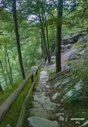 Nach der Besichtigung der Aussichtspunkte und des "Doms" führt unser Weg weiter: Der Höhenweg zweigt kurz vor den Stiegen zurück zum Eingang nach links ab. Über Holztreppen bergauf und dann eine Weile über ein wenig ausgesetztere Pfade im Wald oberhalb der Schlucht entlang. Die Wanderung führt durch beeindruckende, üppige Natur und bringt uns in einer Runde zum Ausgangspunkt zurück.