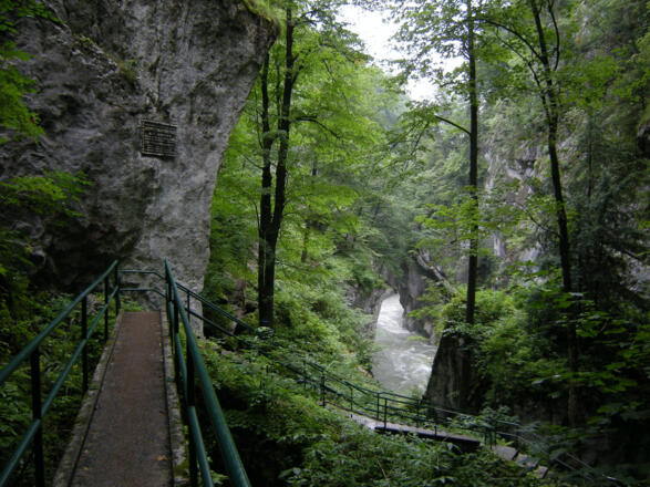 Von der Bushaltestelle gehen wir zum Eingang der Salzachöfen, um uns die imposante Schlucht näher anzusehen. Am Weg zurück (Richtung Eingang) zweigt der Höhenweg kurz vor den Stiegen links ab.