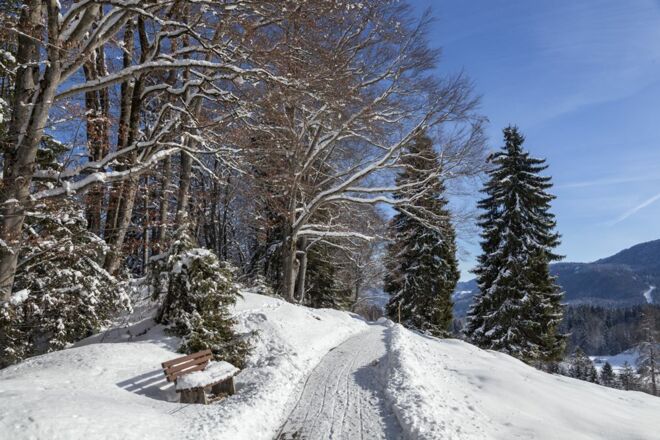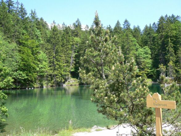 Vom Startpunkt am Kurhaus gehst Du zur Waxensteinstraße und überquerst sie am Minigolfplatz. Hier nimmst Du den Fußweg Richtung Rosensee. Ein kurzer leichter Anstieg bringt Dich durch den Baderseewald zum Badersee. An der Westseite des Sees führt kurz nach dem Bootsanleger des Hotels ein Fußweg im Wald Richtung Eibsee. Es geht kurz bergan bevor der Weg dann fast eben verläuft. Beim Verlassen des Waldes triffst Du auf das Häuschen einer Wasserreserve, das Du rechts auf einem kleinen Querweg umgehst. Hier