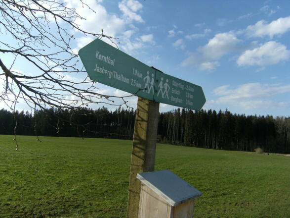 Vom Parkplatz am Penny-Markt in Otterfing zuerst kurz entlang des Kölblwegs und dann gleich links auf die Palnkamer Straße, der wir vorerst folgen, bis der Erlacher Weg nach rechts abzweigt. Vorbei an einem Bauernhof und später im Wald, durch das Kerntal gelangen wir nach Erlach. Jetzt gehts erst einmal bergauf: In Erlach halten wir uns links und gelangen auf der Jasberger Straße hinauf auf den Jasberg - traumhafter Blick in Richtung Alpen inklusive. Oben angekommen geht es nach links über ein Teersträßchen abwärts, und, sobald dieses auf die Straße zwischen Palnkam und Thalham trifft, nach links in Richtung Palnkam. Kurz bevor Palnkam erreicht wird biegen wir nach einer S-Kurve nach links in einen kleinen Feldweg ab, der uns bald wieder auf den bereits bekannten Weg und weiter zum Ausgangspunkt bringt.