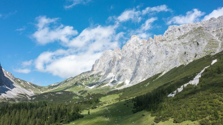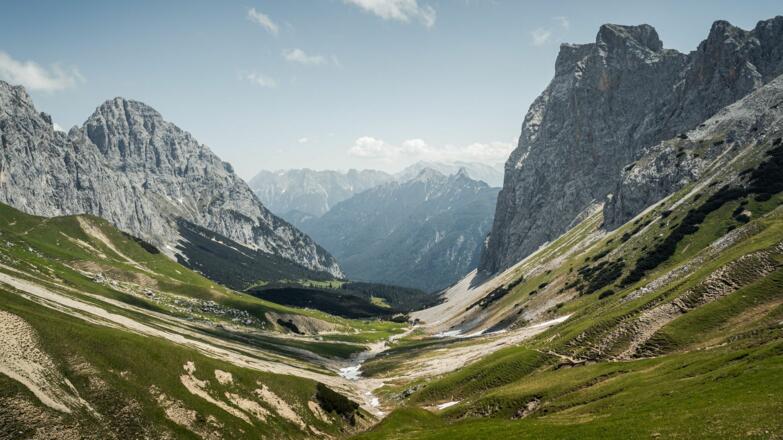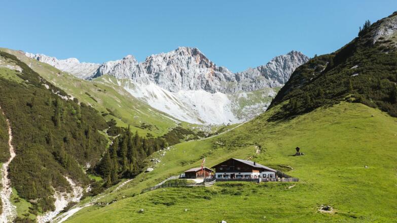 Absteigen kann man entweder über den gleichen Weg oder über die Wangalm und Wettersteinhütte. Wer sich für letzteres entscheidet, folgt dem Weg ab dem Scharnitzjoch Richtung Wangalm und steigt über saftige Almwiesen und Kuhweiden ab. Die beiden Almen liegen nur 10 Minuten voneinander entfernt und bieten beide herrliche Sonnenterassen, urige Stuben, sehr gute Kulinarik und herzliche Gastfreundschaft. Von hier aus kann man bis ins Gaistal absteigen.
