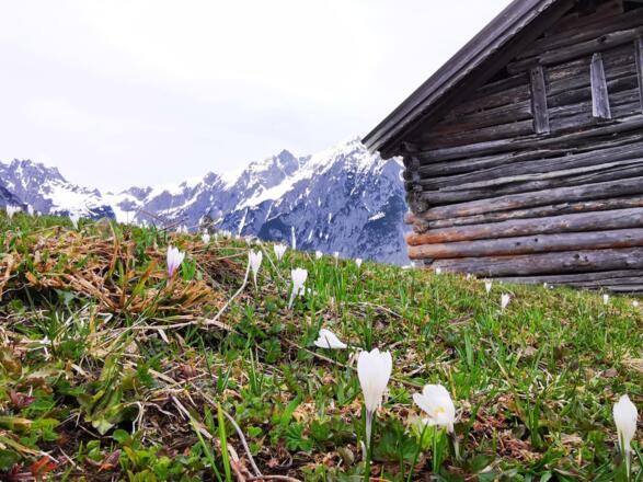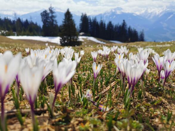 Hier oben angelangt belohnt uns der prachtvolle Blick ins Karwendelgebirge im Norden, im Süden schweift er zu den Tuxer und Zillertaler Alpen.